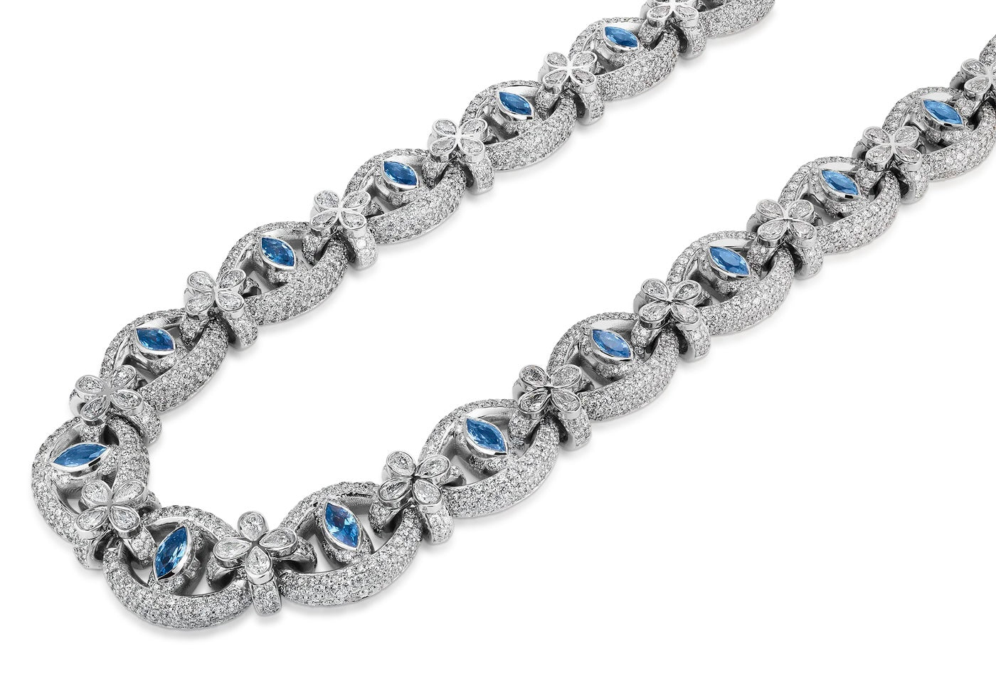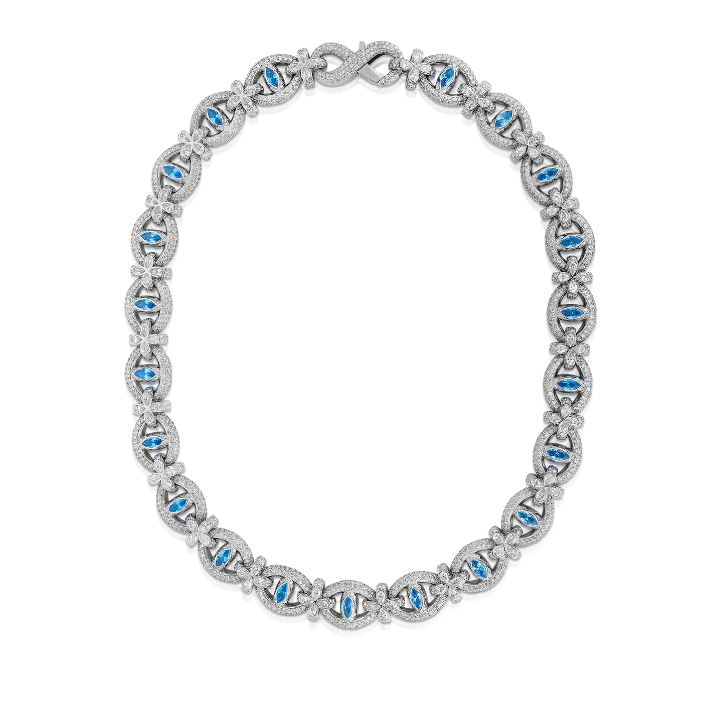 A high-precision execution of white diamonds and vivid sapphire accents.