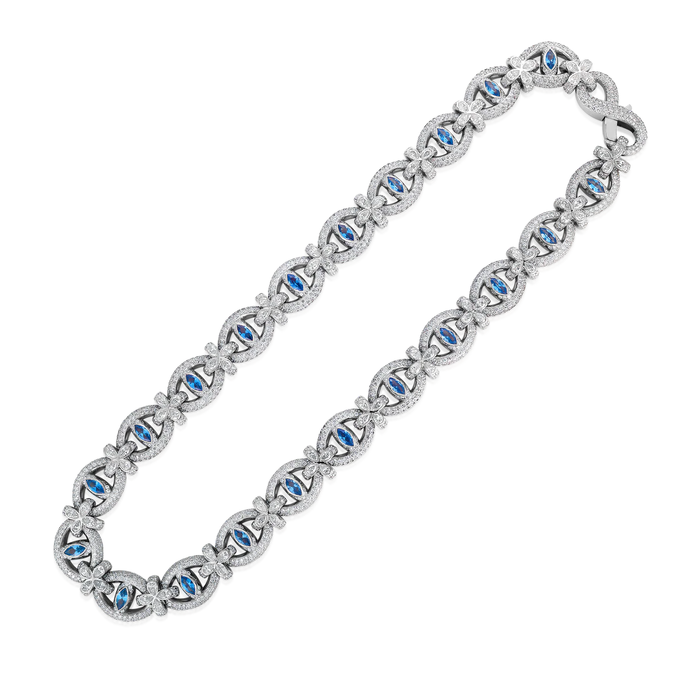 The structure features full pavé borders, floral diamond clusters, and alternating sapphire marquise centers for contrast and depth.