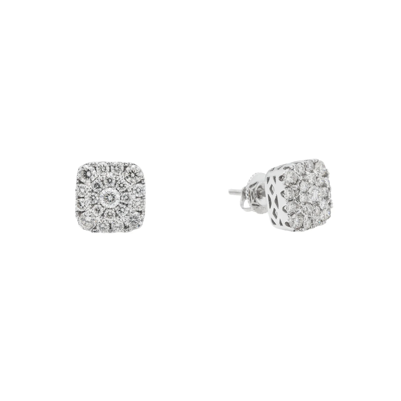 Crafted in solid 14K white gold, these stud earrings feature a cushion-shaped diamond layout built from a center cluster and framed by concentric pavé rows. The structured square profile gives the illusion of a larger single stone while keeping clean balance and symmetry. The elevated side design adds depth, allowing light to reflect from multiple angles for a full, dimensional sparkle.