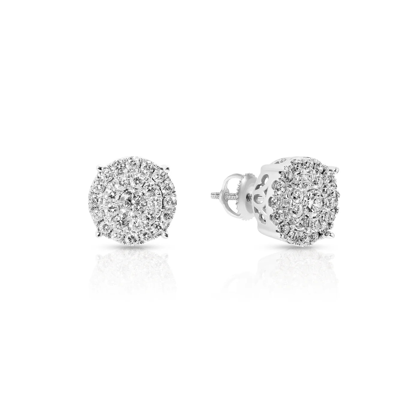 A bold double-halo design built for strong presence and full surface sparkle. Featuring hand-matched round brilliant diamonds arranged in a seamless cluster pattern, these studs create the look of a larger single stone with clean symmetry and high fire. Crafted in solid 14K white gold and finished with secure screw-back posts for everyday confidence.