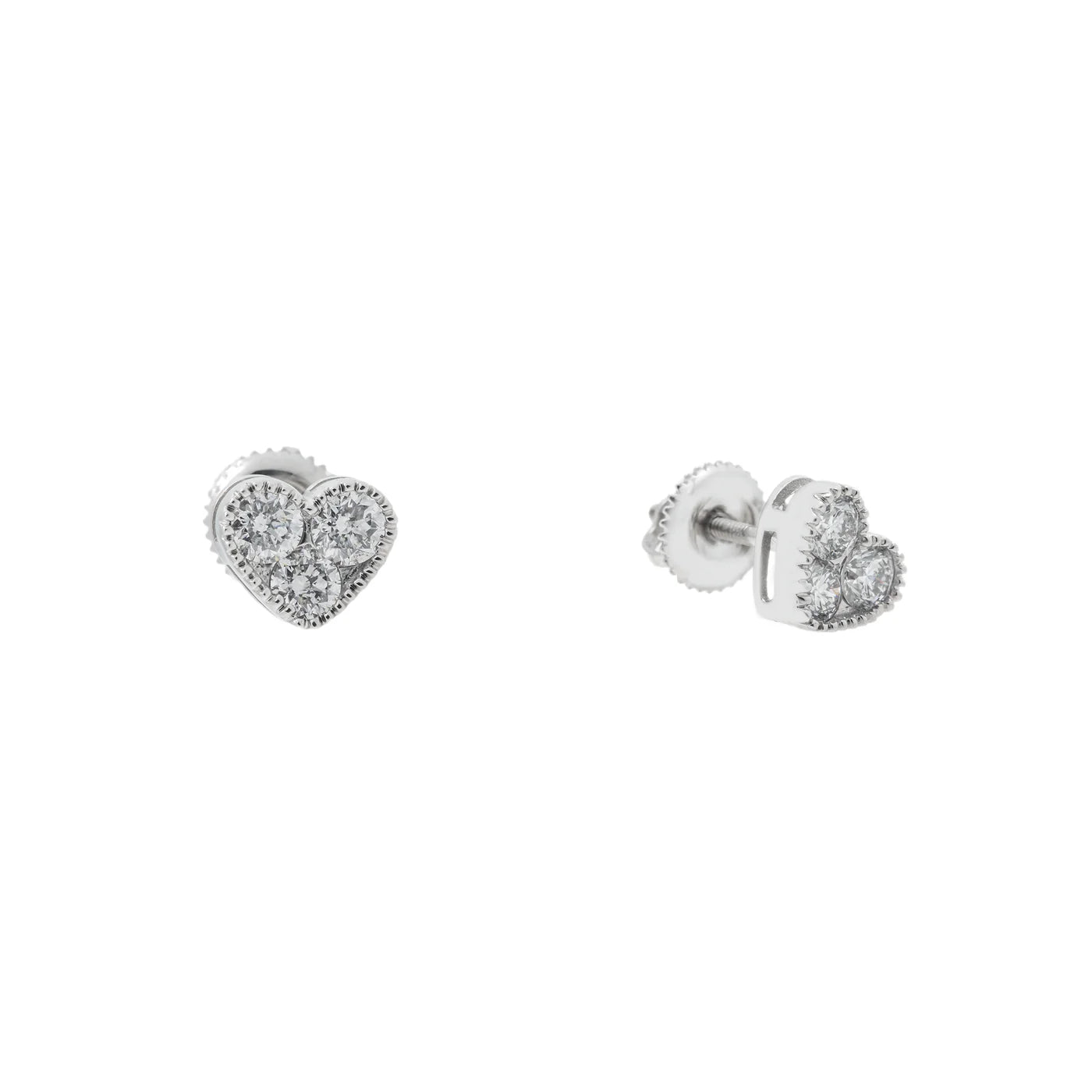 Crafted in solid 14K white gold, these diamond heart studs feature a clustered round-diamond design that enhances light return and gives the appearance of a larger single stone. The edges are refined with precise detailing, keeping the silhouette clean, balanced, and feminine.