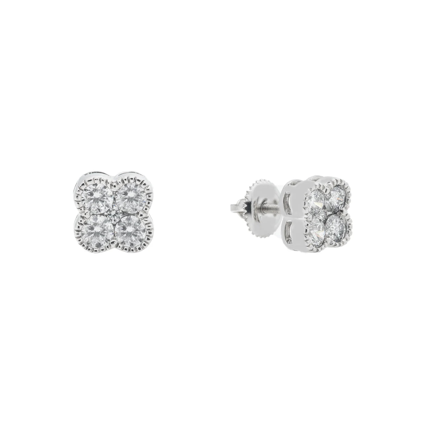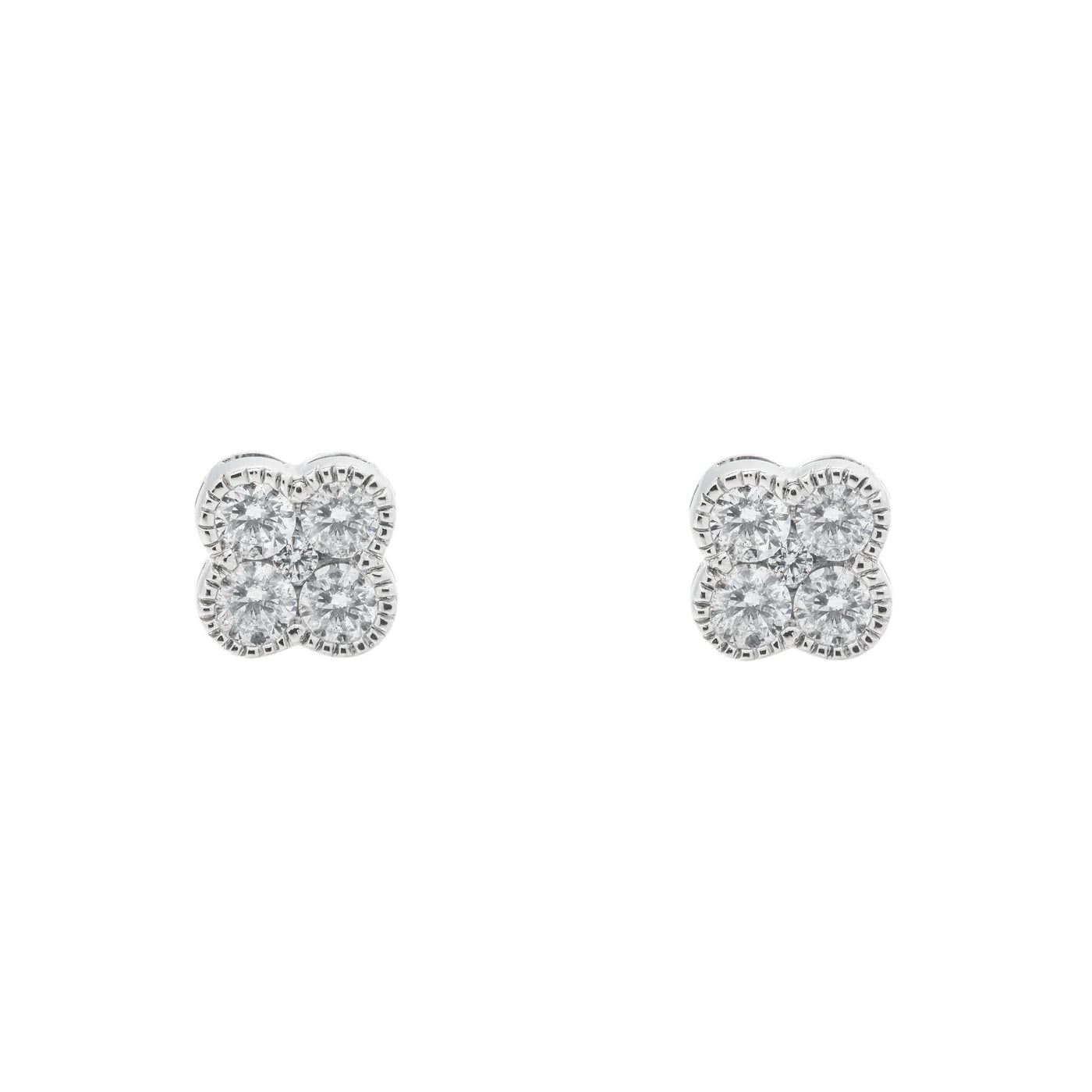 The LeRongé Carré earrings feature a four-stone diamond cluster arranged in a clean square silhouette, designed to maximize sparkle while keeping a subtle, modern presence. Crafted in solid 14K white gold, each diamond is handset with precision, creating the look of a single, larger stone with a structured, elevated finish. The milgrain detail adds texture and depth while maintaining a timeless aesthetic.