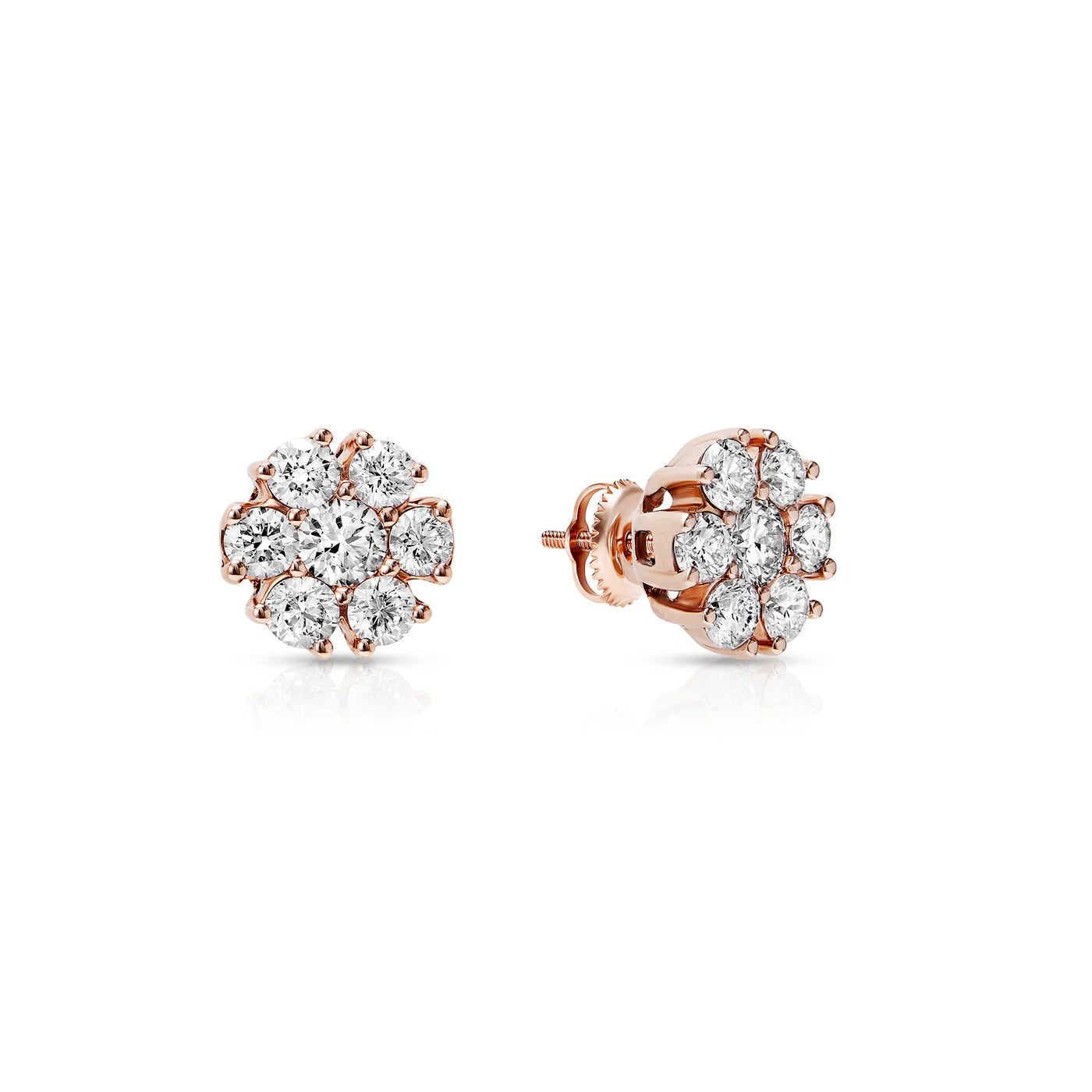 A bold floral-style cluster crafted in solid 14K rose gold and set with hand-matched round brilliant diamonds. The design creates a seamless full-face shine with the look of a larger single stone, while maintaining clean symmetry and strong light return. Finished with secure screw-back posts for a comfortable and reliable fit.