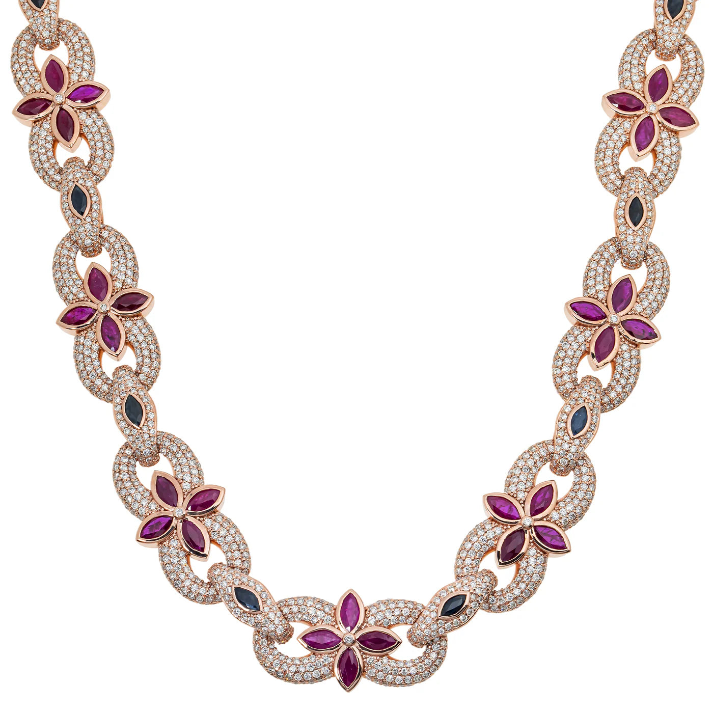 Crafted in solid 10K rose gold, this necklace features a repeating floral motif set with rich marquise-cut rubies and sapphires, framed by pavé-set round diamonds across every link. Each section is designed for balance and movement, creating a continuous flow of brilliance around the neckline. The custom clasp is seamlessly integrated into the pattern for a clean, uninterrupted finish.